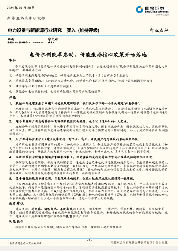 【国金证券】【20210729】电力设备与新能源行业研究:电价机制改革启动,储能激励核心政策开始落地-3页
