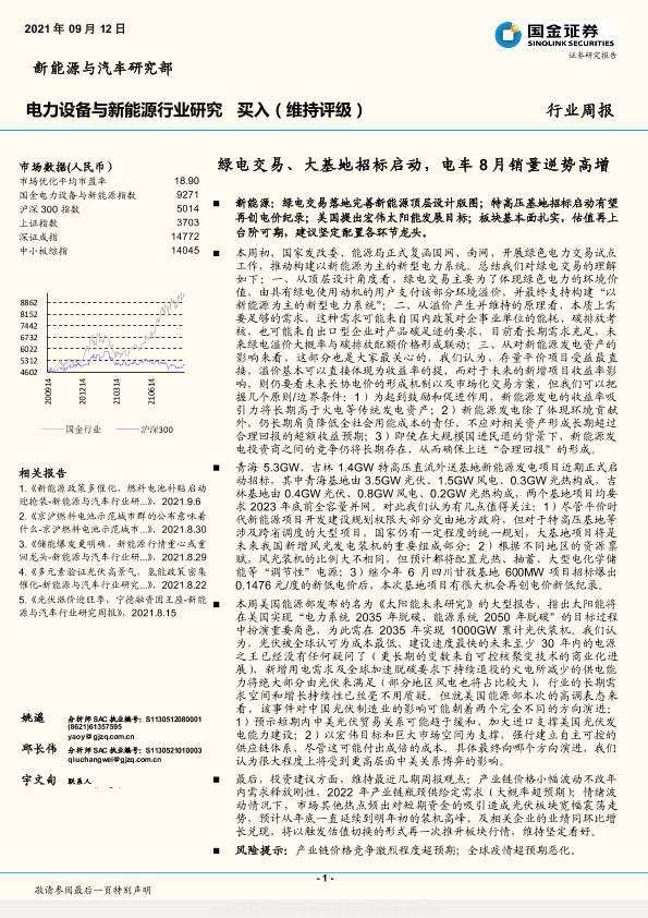 【国金证券】【20210912】电力设备与新能源行业研究:绿电交易、大基地招标启动,电车8月销量逆势高增-5页