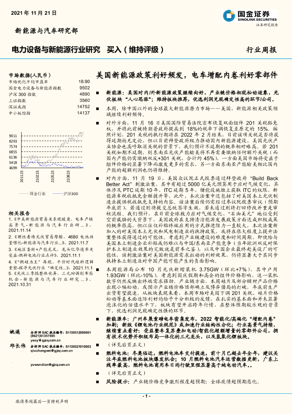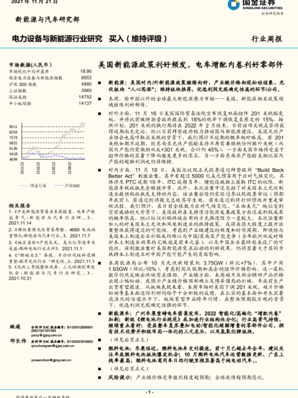 【国金证券】【20211121】电力设备与新能源行业研究:美国新能源政策利好频发,电车增配内卷利好零部件-5页
