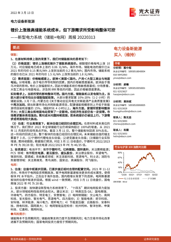 【光大证券】【20220313】20220313-光大证券-新型电力系统(储能+电网)周报:锂价上涨推高储能系统成本,但下游需求所受影响整体可控-6页