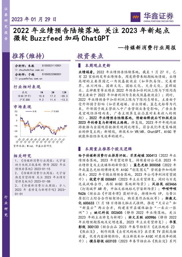 【华鑫证券】【20230129】传媒新消费行业周报:2022年业绩预告陆续落地 关注2023年新起点微软Buzzfeed加码ChatGPT-21页