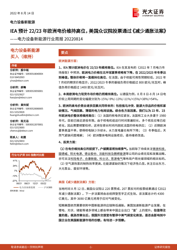 【光大证券】【20220814】电力设备新能源行业周报:IEA预计22 23年欧洲电价维持高位,美国众议院投票通过《减少通胀法案》-5页