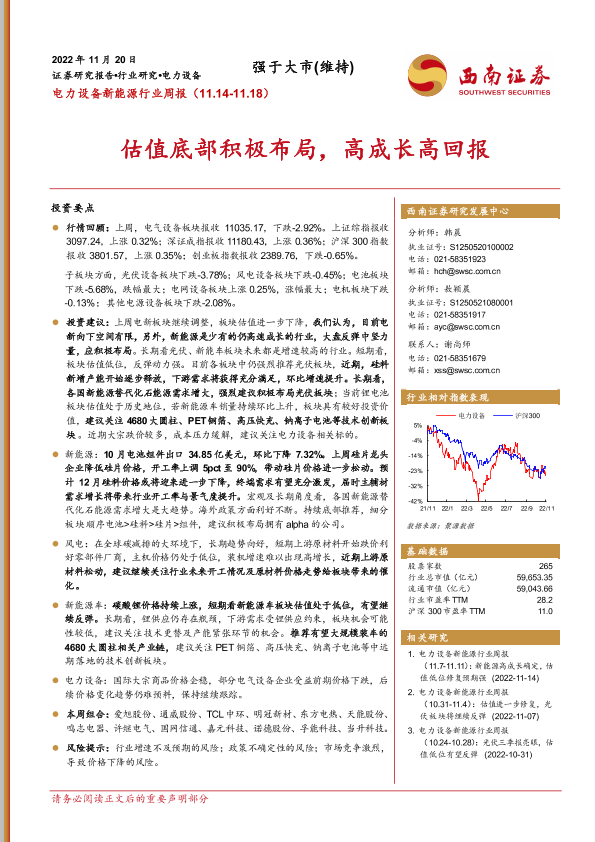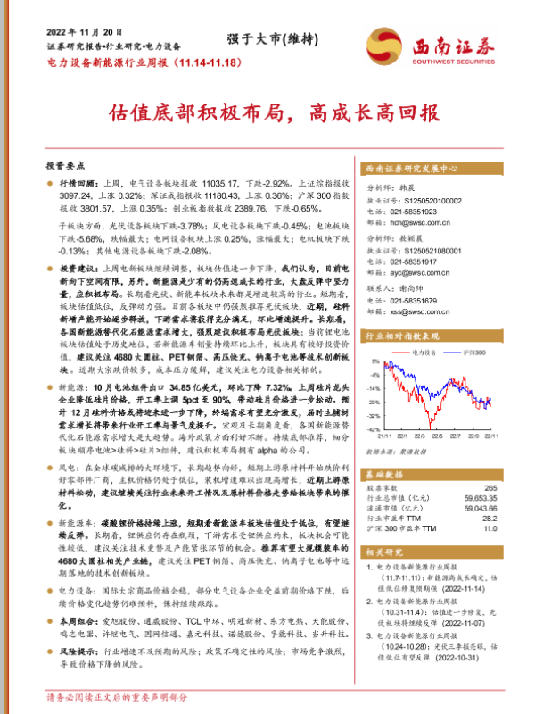 【西南证券】【20221120】20221120-西南证券-电力设备新能源行业周报:估值底部积极布局,高成长高回报-35页