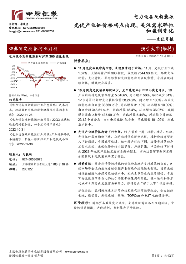【中原证券】【20221206】光伏产业链价格拐点出现,关注需求弹性和盈利变化-13页