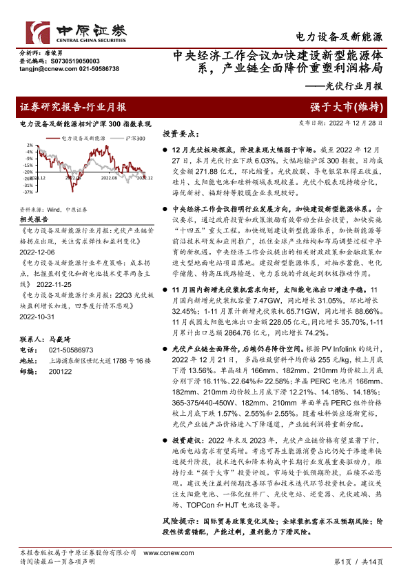 【中原证券】【20221228】光伏行业月报:中央经济工作会议加快建设新型能源体系,产业链全面降价重塑利润格局-14页
