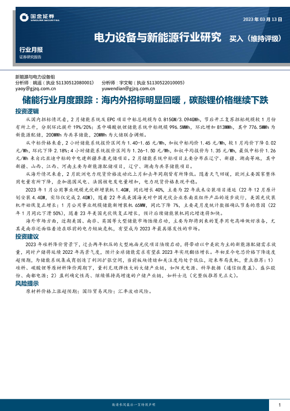 【国金证券】【20230313】20230313-国金证券-电力设备与新能源行业研究:储能行业月度跟踪:海内外招标明显回暖,碳酸锂价格继续下跌-10页