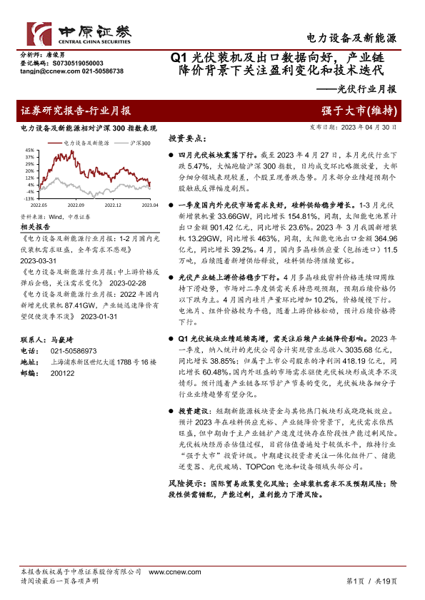 【中原证券】【20230430】Q1光伏装机及出口数据向好,产业链降价背景下关注盈利变化和技术迭代-19页