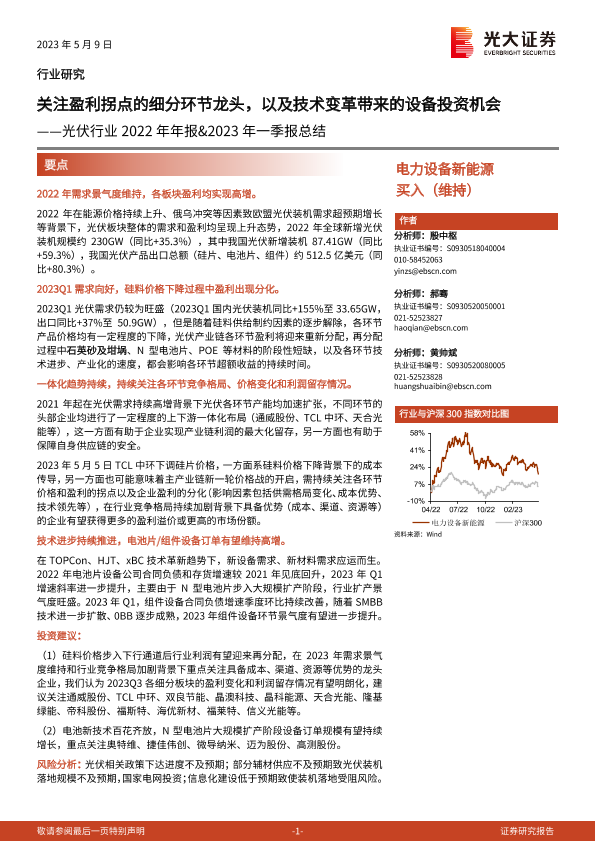 【光大证券】【20230509】光伏行业2022年年报&2023年一季报总结:关注盈利拐点的细分环节龙头,以及技术变革带来的设备投资机会-11页