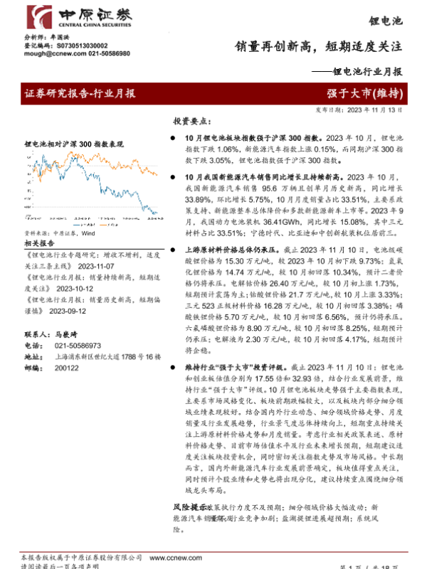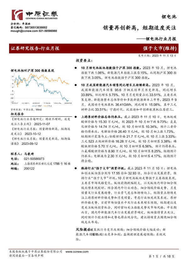 【中原证券】【20231113】锂电池行业月报:销量再创新高,短期适度关注-18页