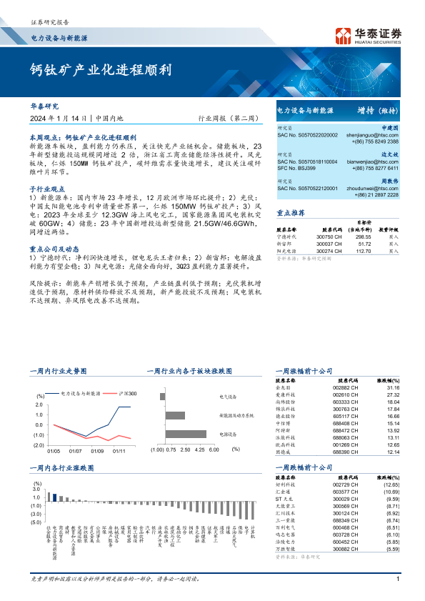 【华泰证券】【20240114】电力设备与新能源行业周报(第二周):钙钛矿产业化进程顺利-21页