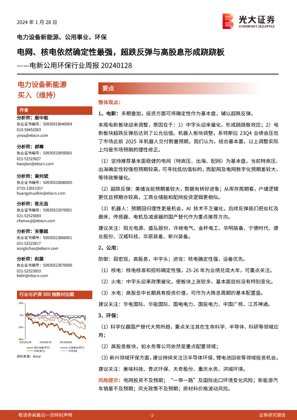 【光大证券】【20240128】电新公用环保行业周报:电网、核电依然确定性最强,超跌反弹与高股息形成跷跷板-25页