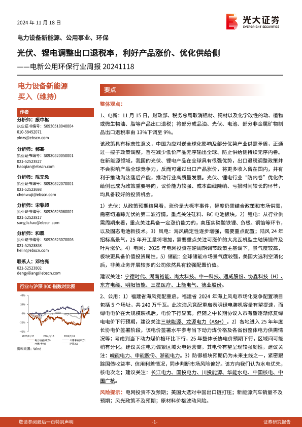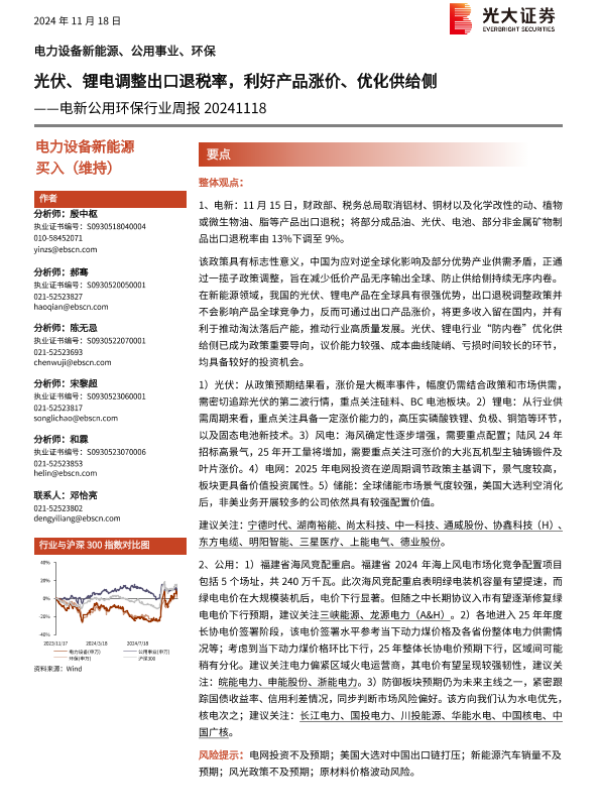 【光大证券】【20241118】电新公用环保行业周报:光伏、锂电调整出口退税率,利好产品涨价、优化供给侧-10页