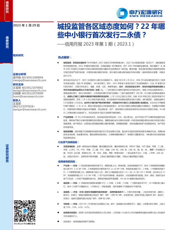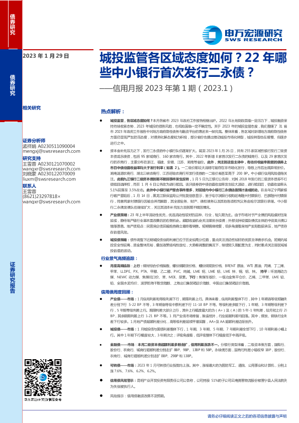 【申万宏源】【20230129】信用月报2023年第1期:城投监管各区域态度如何?22年哪些中小银行首次发行二永债?-23页