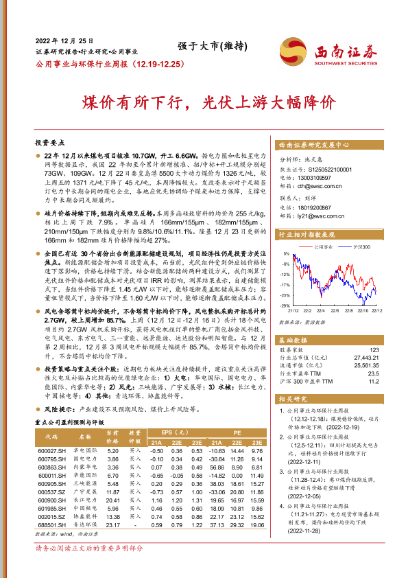 【西南证券】【20221225】公用事业与环保行业周报:煤价有所下行,光伏上游大幅降价-22页