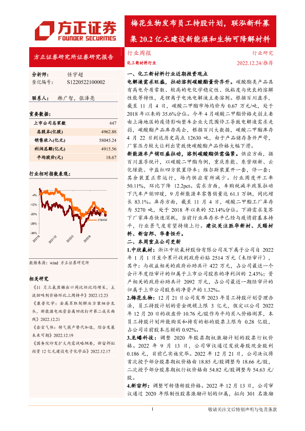 【方正证券】【20221224】化工新材料行业周报:梅花生物发布员工持股计划,联泓新科募集20.2亿元建设新能源和生物可降解材料-41页