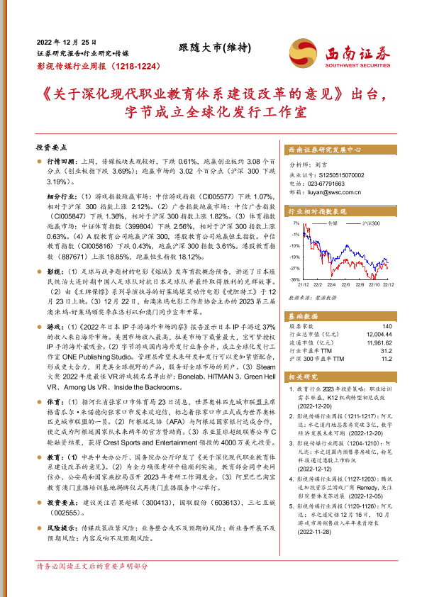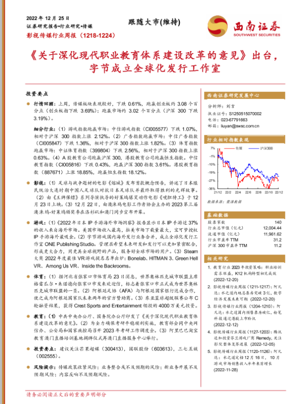 【西南证券】【20221225】影视传媒行业周报:《关于深化现代职业教育体系建设改革的意见》出台,字节成立全球化发行工作室-18页