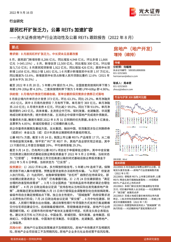 【光大证券】【20220916】房地产行业流动性及公募REITs跟踪报告(2022年8月):居民杠杆扩张乏力,公募REITs加速扩容-19页