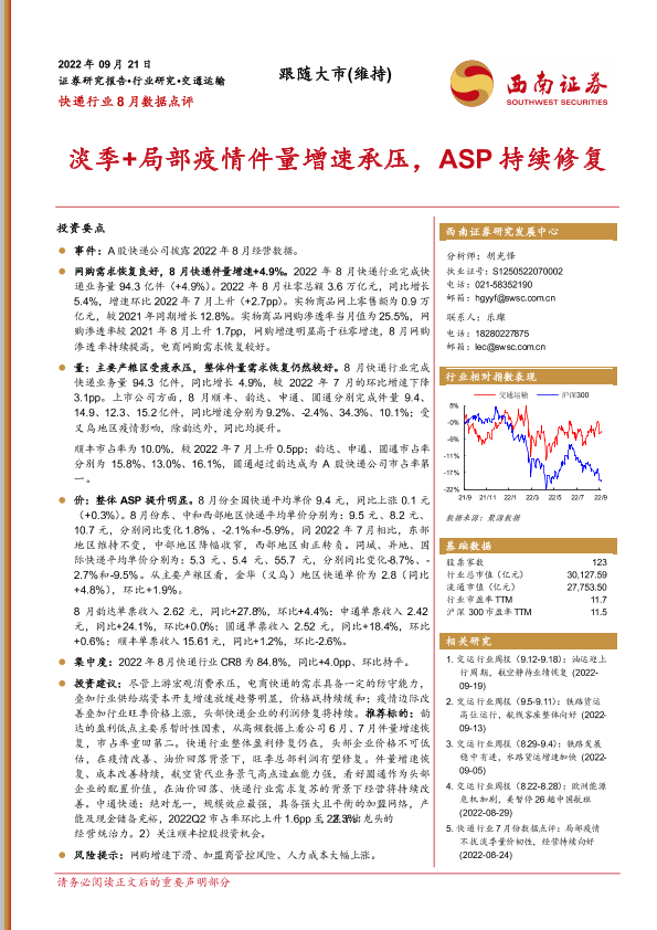 【西南证券】【20220922】快递行业8月数据点评:淡季+局部疫情件量增速承压,ASP持续修复-11页