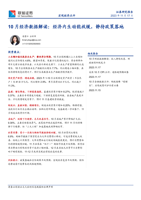 【联储证券】【20231117】10月经济数据解读:经济内生动能放缓,静待政策落地-18页