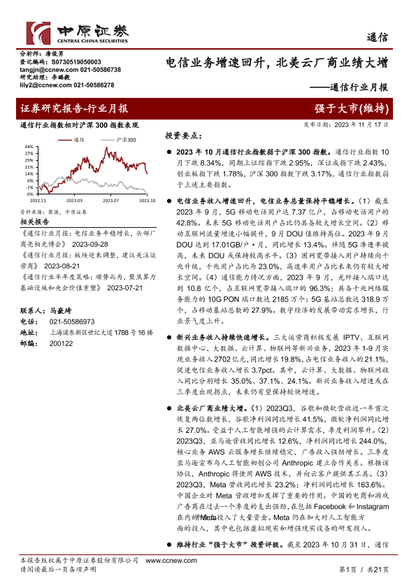 【中原证券】【20231117】通信行业月报:电信业务增速回升,北美云厂商业绩大增-21页