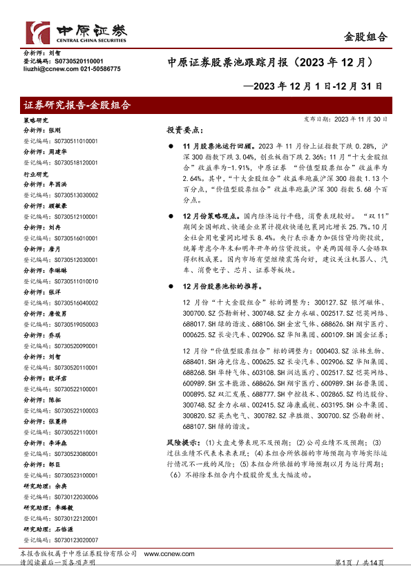 【中原证券】【20231130】股票池跟踪月报(2023年12月)-14页