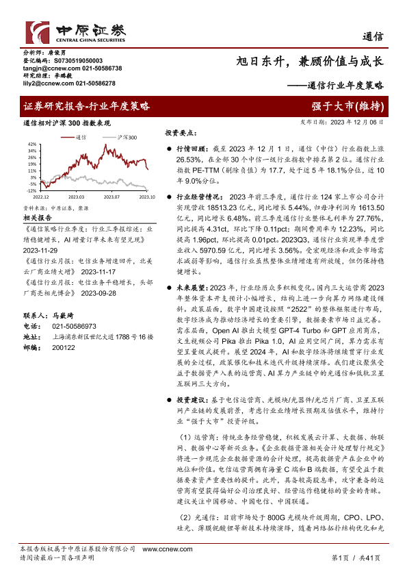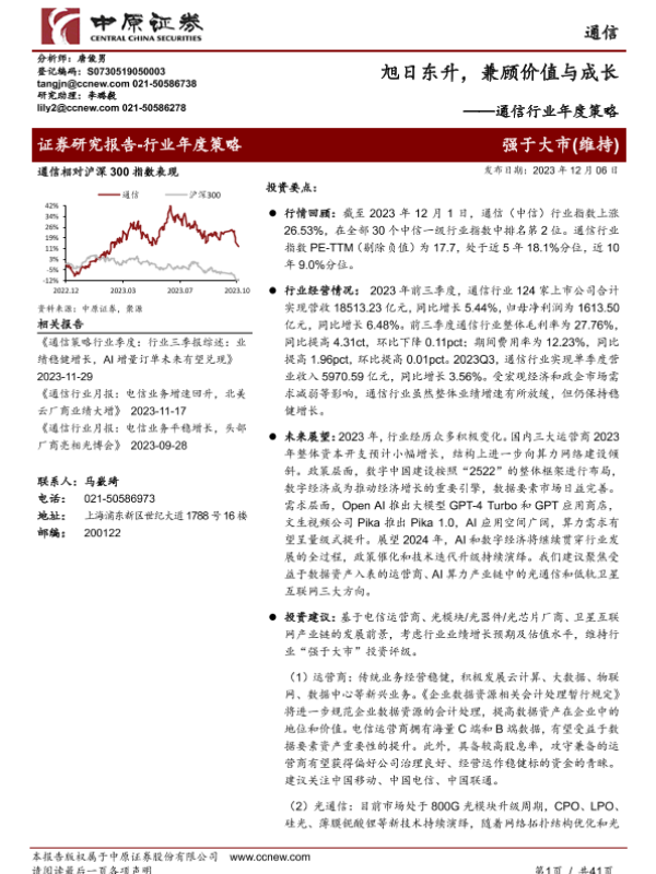 【中原证券】【20231206】通信行业年度策略:旭日东升,兼顾价值与成长-41页