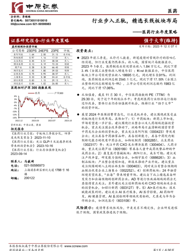 【中原证券】【20231207】医药行业年度策略:行业步入正轨,精选长线板块布局-30页