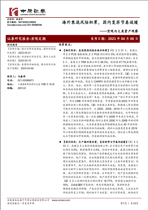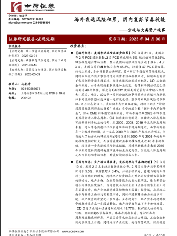 【中原证券】【20230406】宏观与大类资产观察:海外衰退风险积累,国内复苏节奏放缓-15页