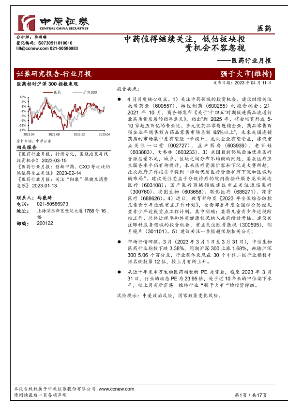 【中原证券】【20230411】医药行业月报:中药值得继续关注,低估板块投资机会不容忽视-17页