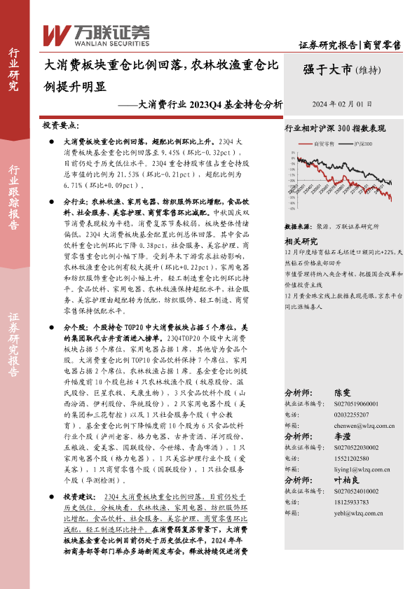 【万联证券】【20240201】大消费行业2023Q4基金持仓分析:大消费板块重仓比例回落,农林牧渔重仓比例提升明显-12页