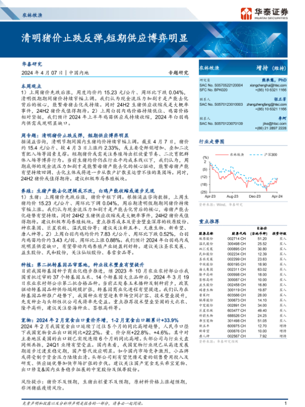 【华泰证券】【20240407】农林牧渔行业:清明猪价止跌反弹,短期供应博弈明显-21页