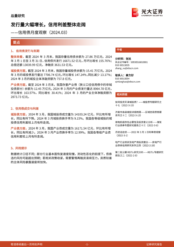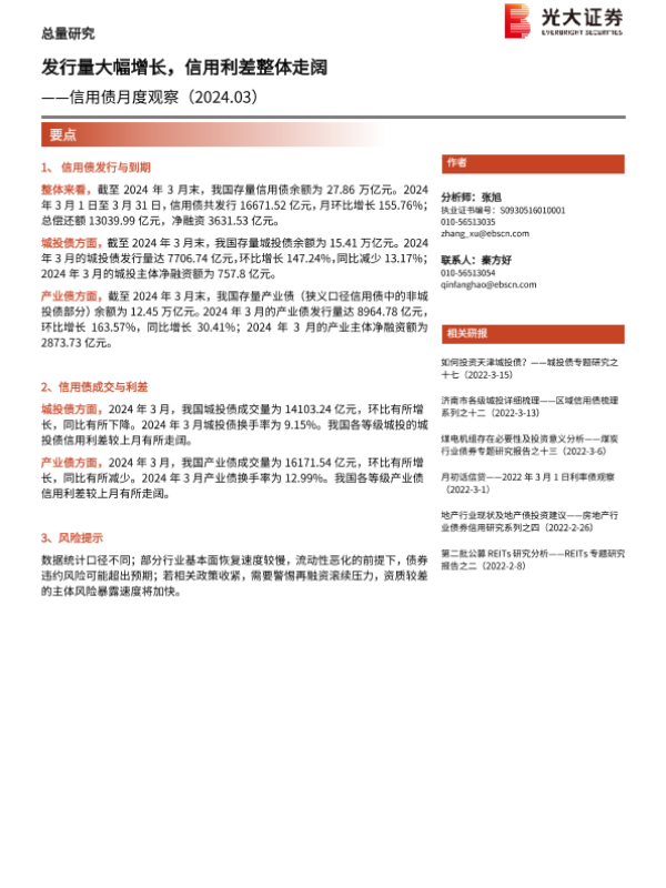 【光大证券】【202403】信用债月度观察:发行量大幅增长,信用利差整体走阔-16页