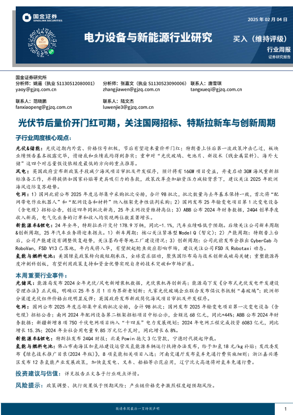 【国金证券】【20250204】电力设备与新能源行业研究:光伏节后量价开门红可期,关注国网招标、特斯拉新车与创新周期-17页