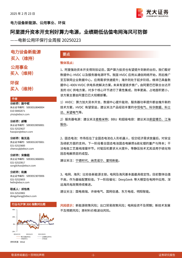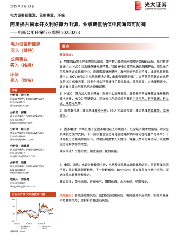 【光大证券】【20250223】电新公用环保行业周报:阿里提升资本开支利好算力电源,业绩期低估值电网海风可防御-10页