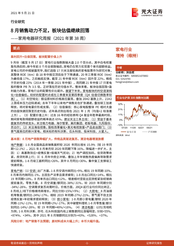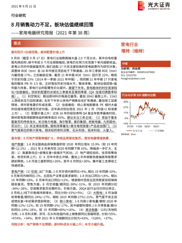 【光大证券】【20210921】家用电器研究周报(2021年第38周):8月销售动力不足,板块估值继续回落-27页
