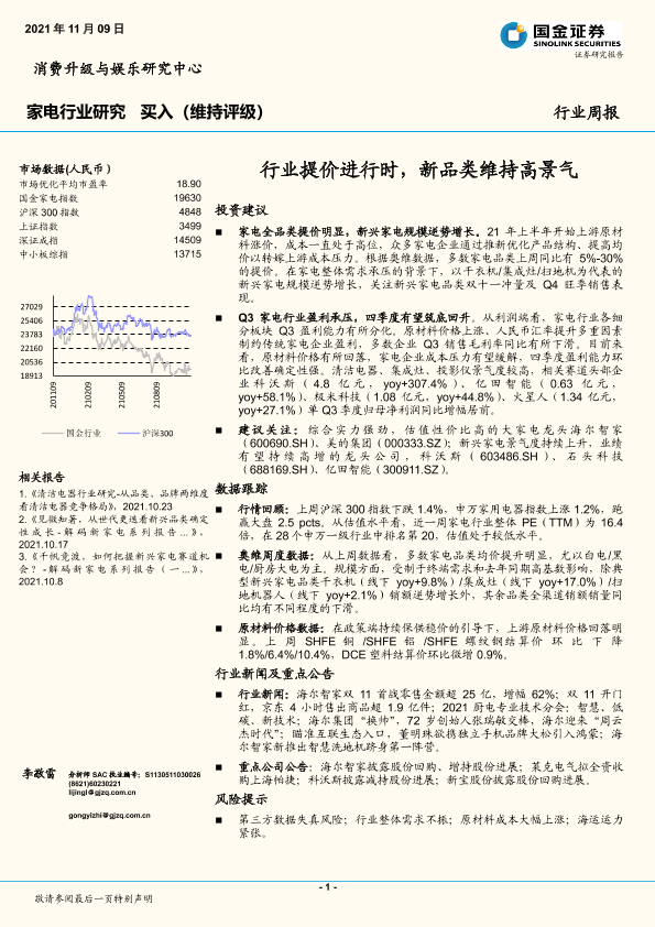【国金证券】【20211109】家电行业周报:行业提价进行时,新品类维持高景气-15页