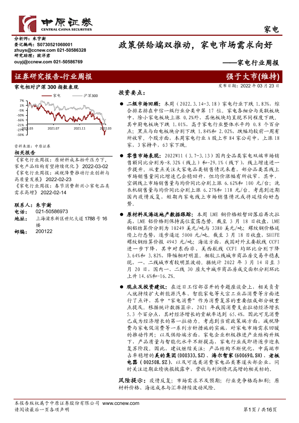 【中原证券】【20220323】家电行业周报:政策供给端双推动,家电市场需求向好-16页