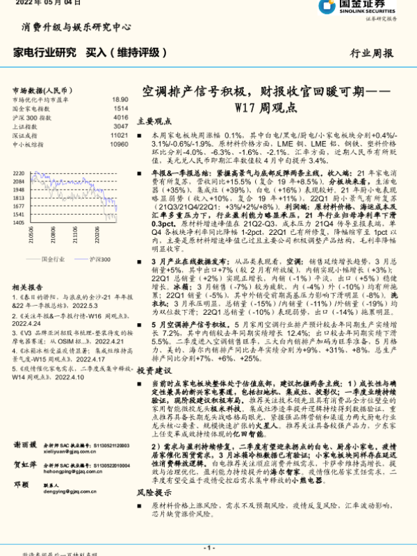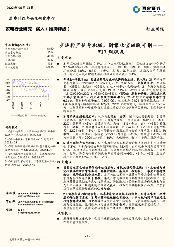 【国金证券】【20220504】家电行业研究W17周观点:空调排产信号积极,财报收官回暖可期-19页