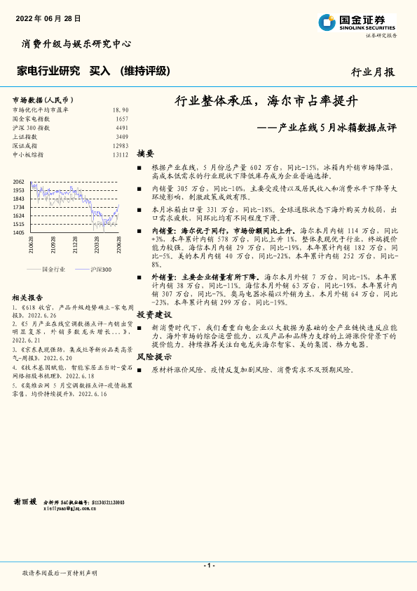 【国金证券】【20220628】20220628-国金证券-家电行业研究:产业在线5月冰箱数据点评-行业整体承压,海尔市占率提升-6页