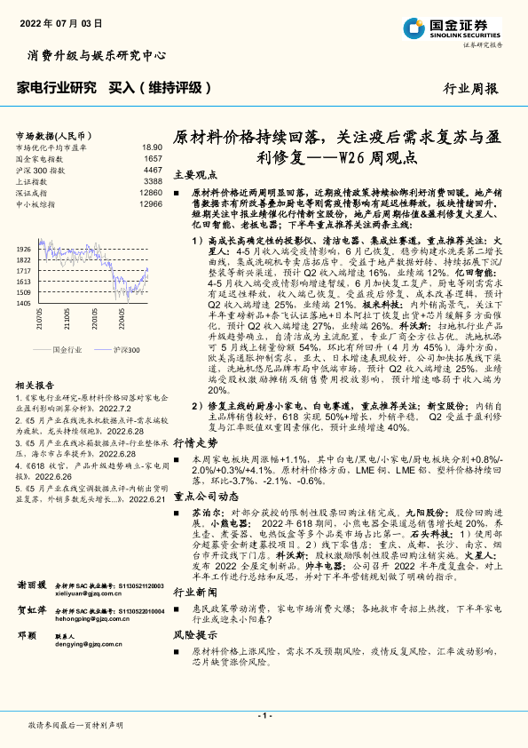 【国金证券】【20220703】20220703-国金证券-家电行业研究W26周观点:原材料价格持续回落,关注疫后需求复苏与盈利修复-14页