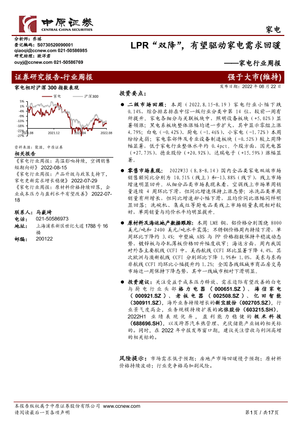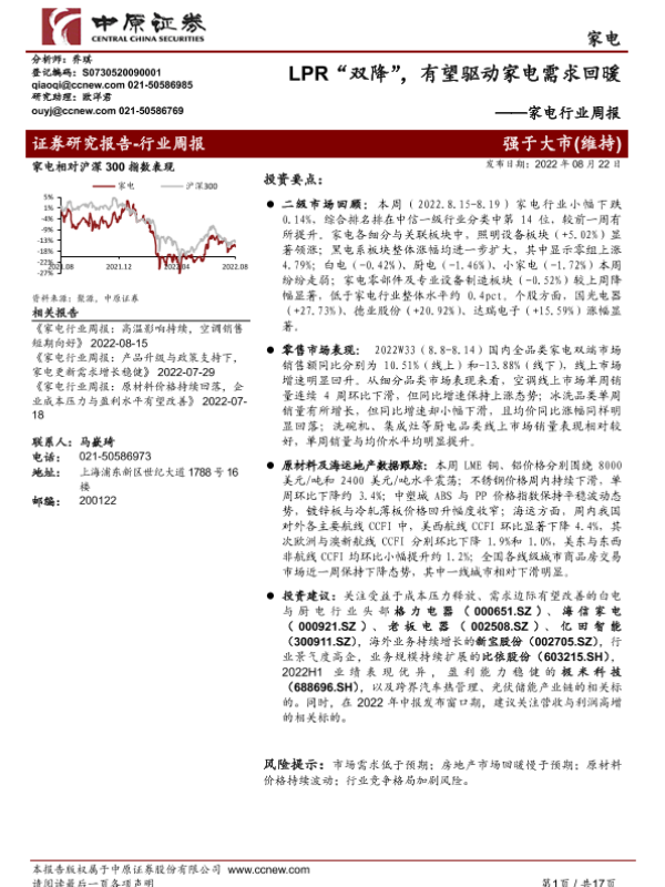 【中原证券】【20220822】家电行业周报:LPR“双降”,有望驱动家电需求回暖-17页
