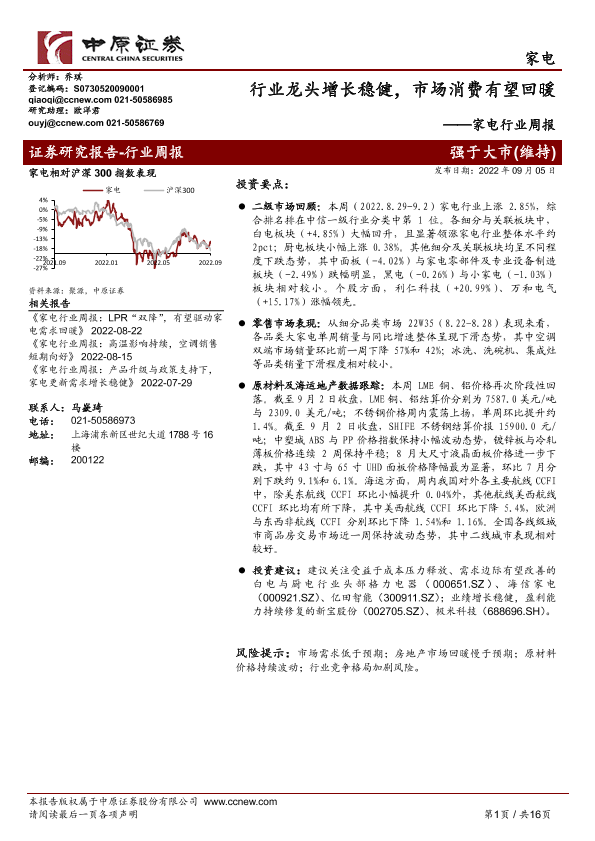 【中原证券】【20220905】家电行业周报:行业龙头增长稳健,市场消费有望回暖-16页