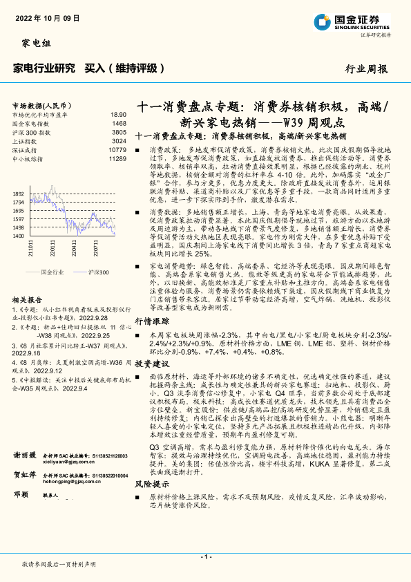【国金证券】【20221009】20221009-国金证券-家电行业研究W39周观点:一消费盘点专题:消费券核销积极,高端 新兴家电热销-15页
