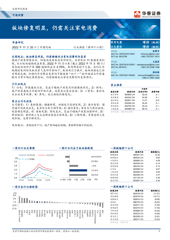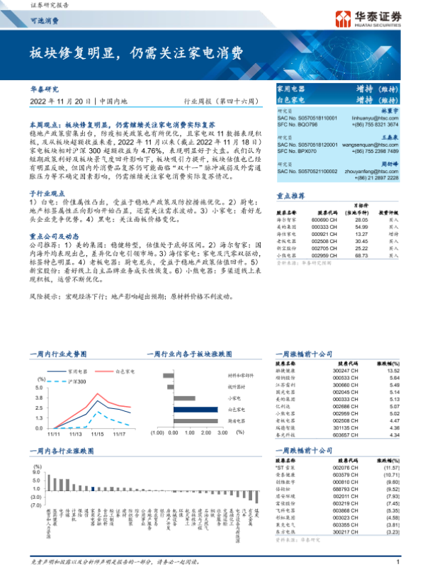 【华泰证券】【20221120】20221120-华泰证券-可选消费行业周报(第四十六周):板块修复明显,仍需关注家电消费-13页