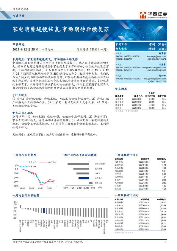 【华泰证券】【20221225】20221225-华泰证券-可选消费行业周报(第五十一周):家电消费缓慢恢复,市场期待后续复苏-13页