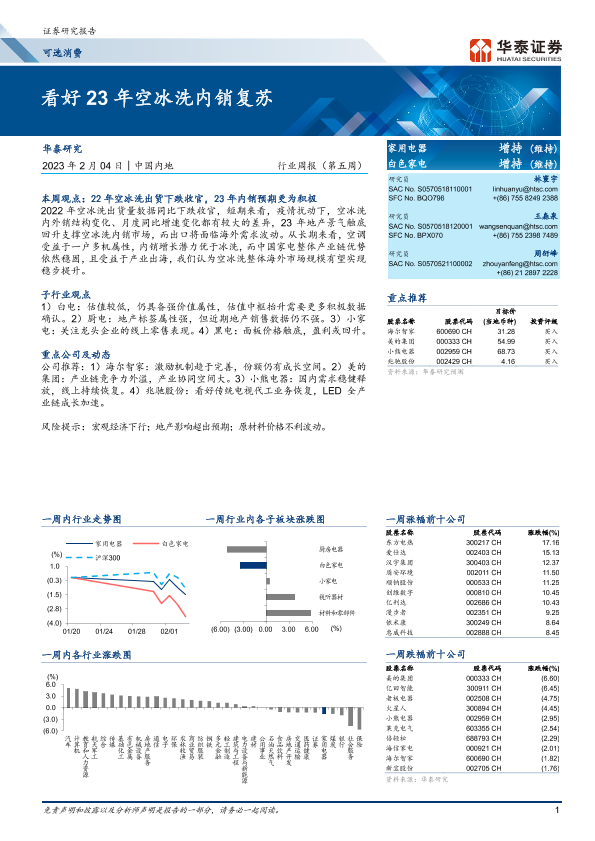 【华泰证券】【20230204】20230204-华泰证券-可选消费行业周报(第五周):看好23年空冰洗内销复苏-14页