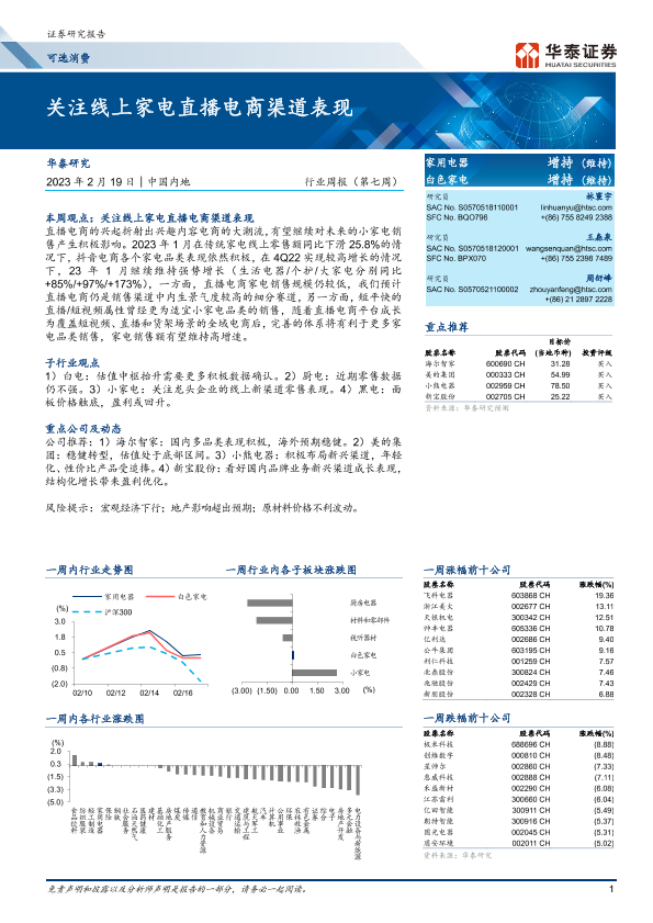 【华泰证券】【20230219】20230219-华泰证券-可选消费行业周报(第七周):关注线上家电直播电商渠道表现-16页