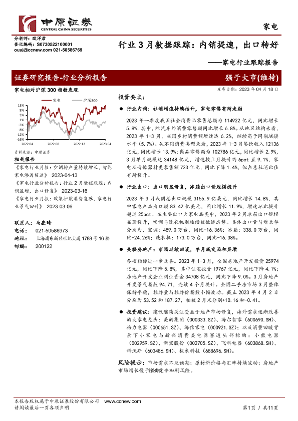 【中原证券】【20230418】家电行业跟踪报告:行业3月数据跟踪:内销提速,出口转好-11页