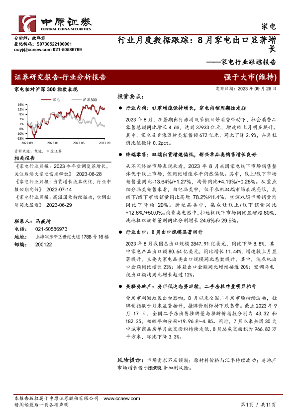 【中原证券】【20230926】家电行业跟踪报告:行业月度数据跟踪:8月家电出口显著增长-11页