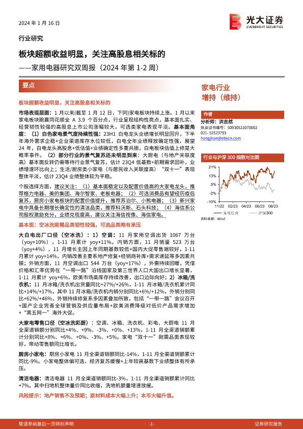 【光大证券】【20240116】家用电器研究双周报(2024年第1-2周):板块超额收益明显,关注高股息相关标的-21页